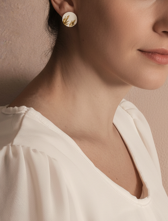 Orecchini a bottone in PORCELLANA bianca limoges con impressioni di spiga di grano* dipinte con ORO liquido